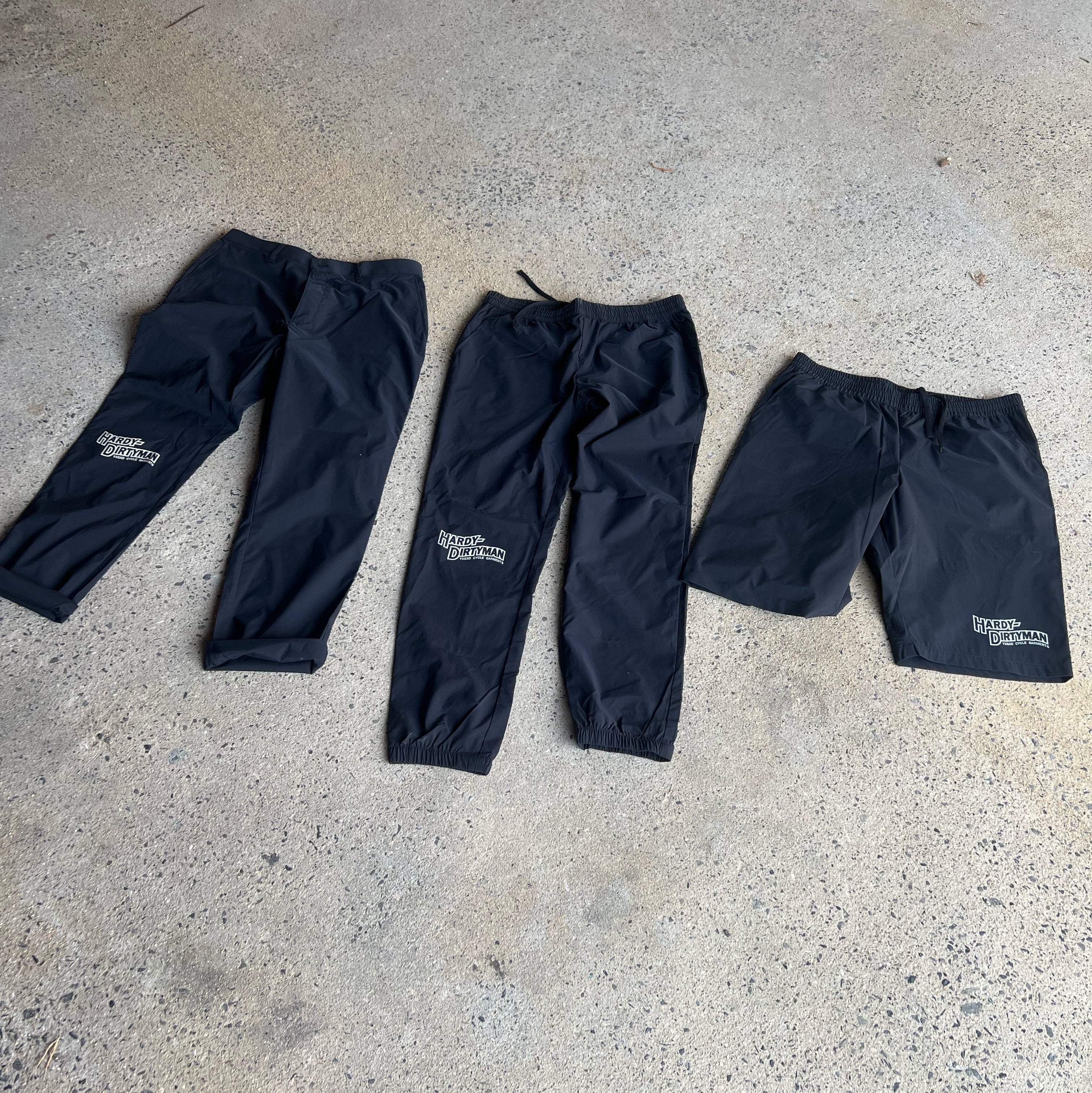 写真真ん中の裾が絞ったパンツ。グレーもあります。伸縮性と速乾性に優れたジョガーパンツ。細めのシルエットです。スポーツする用みたいな感じです。サラサラで軽くウエストゴムでひも付き。両サイドにポケットです。後ろにポケットはありません。