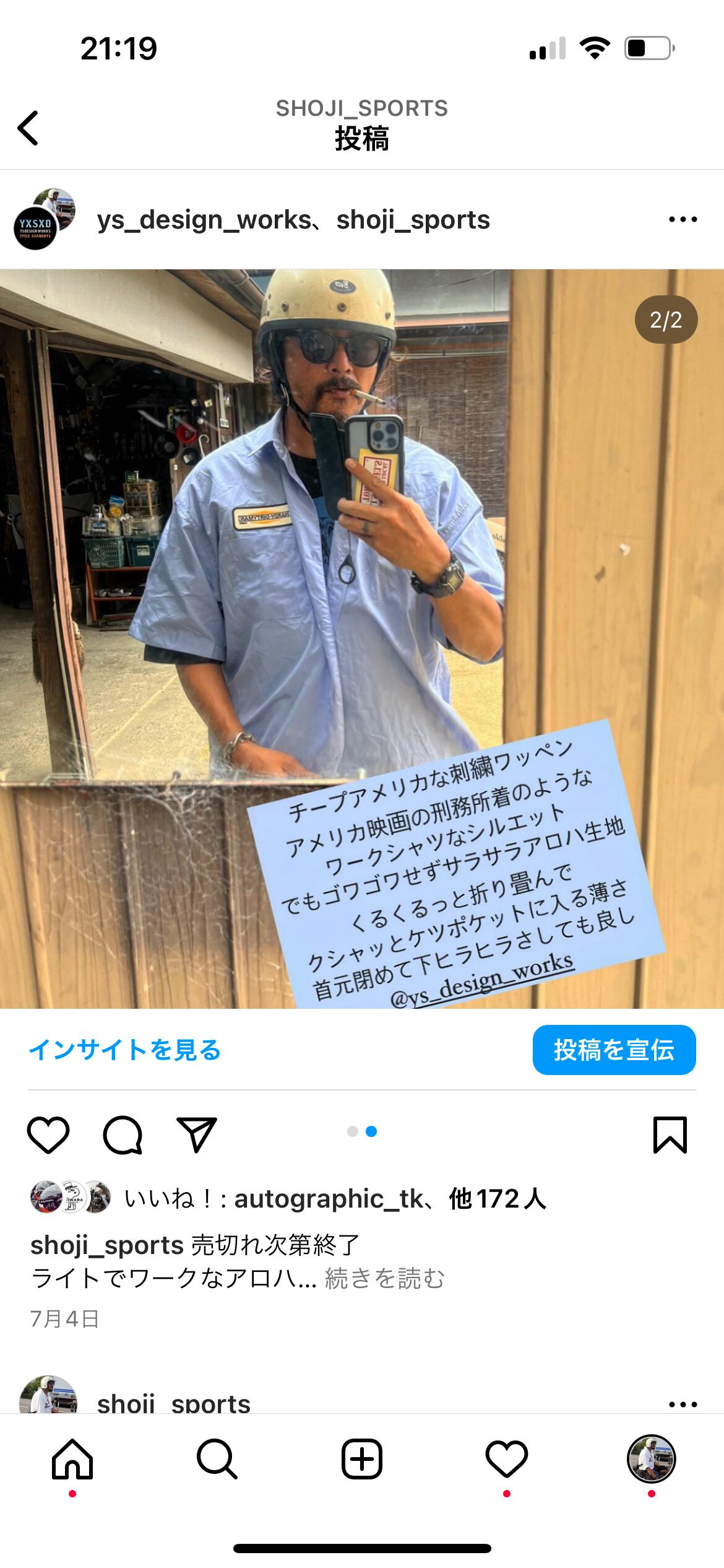 大きめのシルエットで、綿100%ブロードクロスというサラッと涼しくテロっとした生地です。従来のゴワッとしたワークシャツのような見た目でありながらアロハのように1枚でも羽織れます。チープアメリカな刺繍ワッペンです。インナーに80イーグルTeeや白タンクトップで、ちょっとハードル高いですが、パンツにインしたらHEROです。