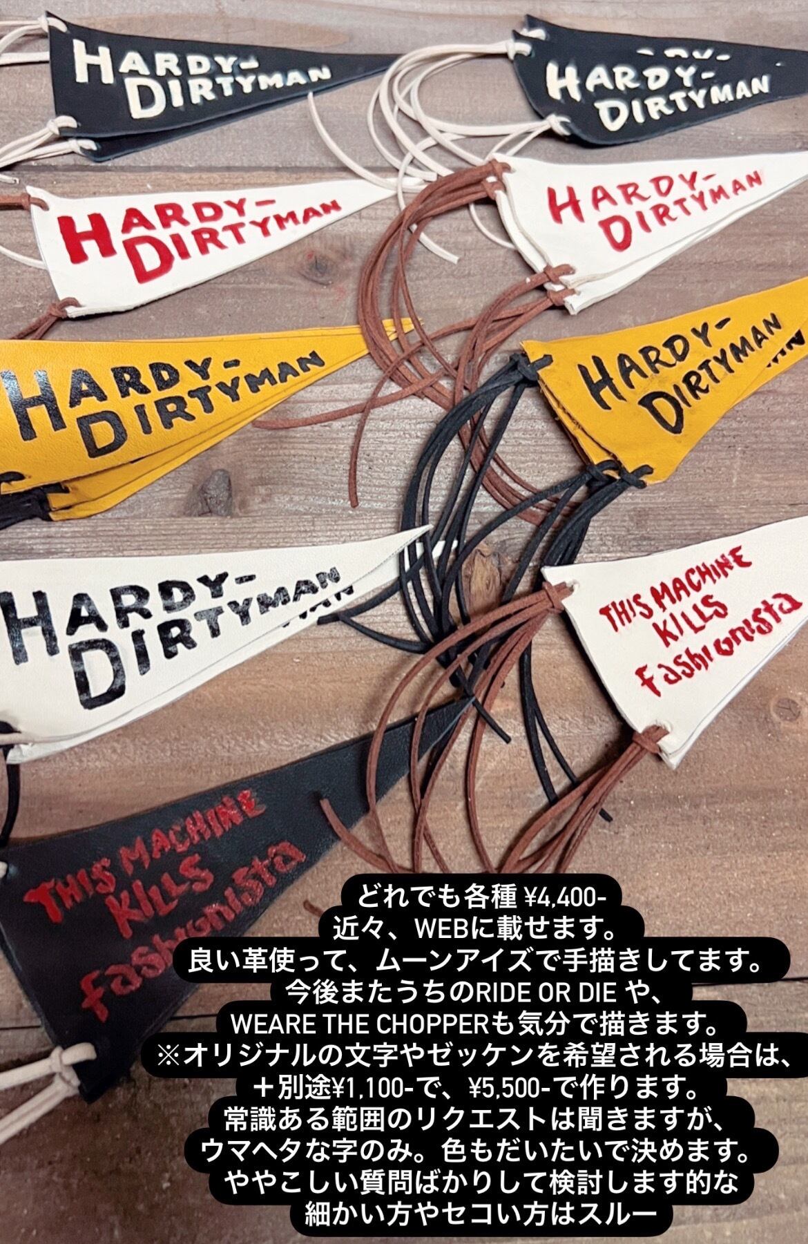 アメリカのレース車輌などに見かけるようなペナント。上質なレザーに、ピンストライプに使うムーンアイズの塗料でレタリングしました。